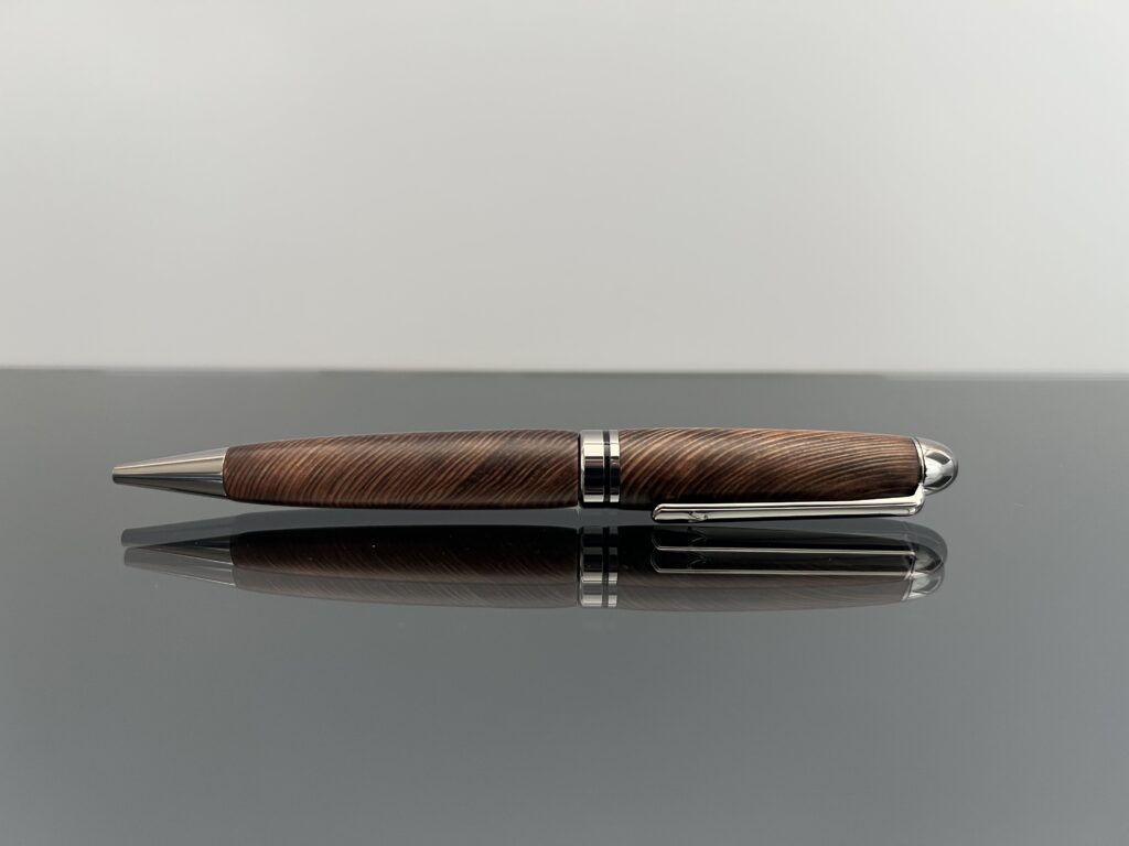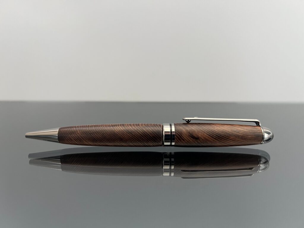 土埋木ならではの深い焦茶色が印象的な屋久杉のボールペンです。樹脂分も豊富で一本の中に多様な色調や濃淡が現れています。眺める角度によって深い緑色のようにも見えるのも見逃せない特徴です。