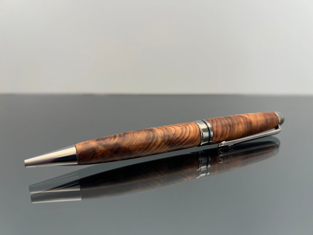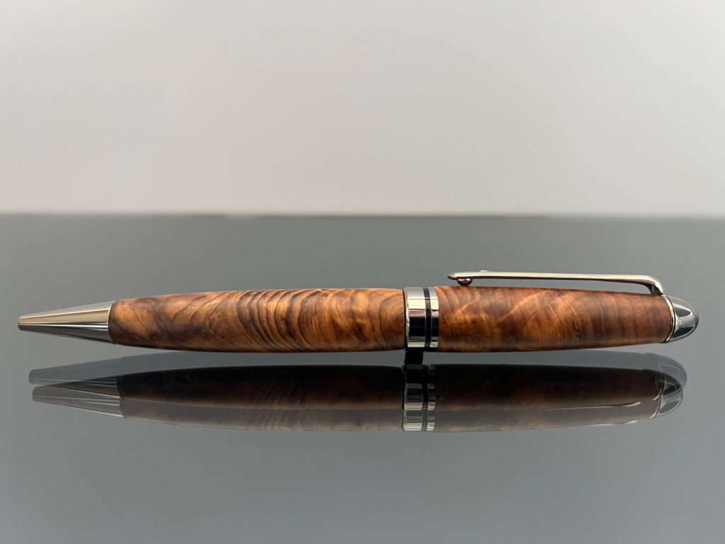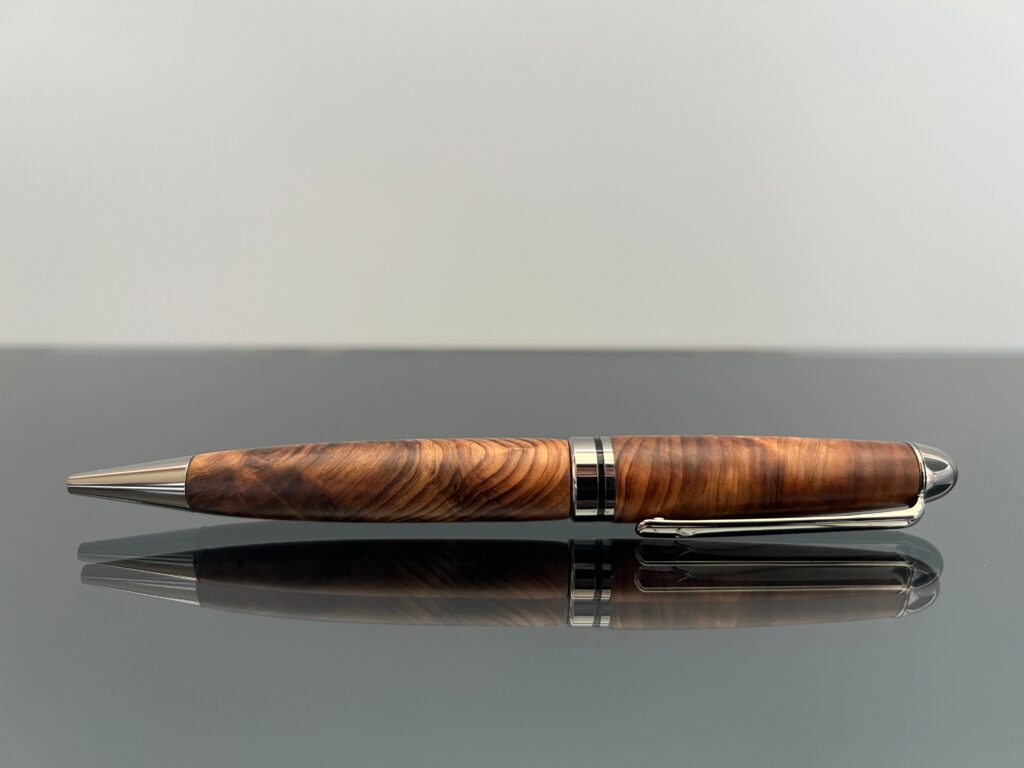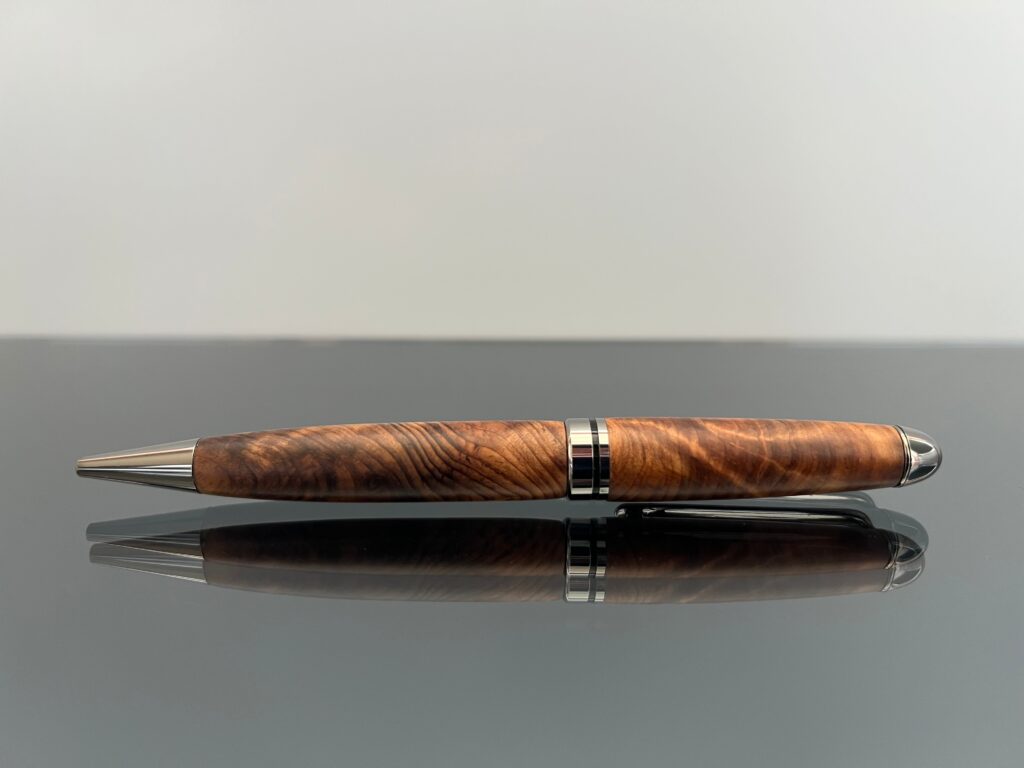 土埋木ならではの深い焦茶色をベースに虎瘤杢(とらこぶ もく)と呼ばれる部分で製作した屋久杉のボールペンです。虎瘤杢は虎の背模様のような縞柄が不均一に景色として現れる杢目のことで、キラキラと輝きます。