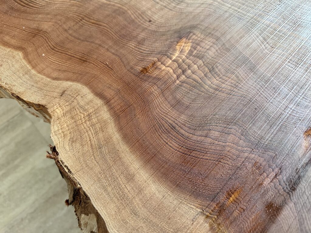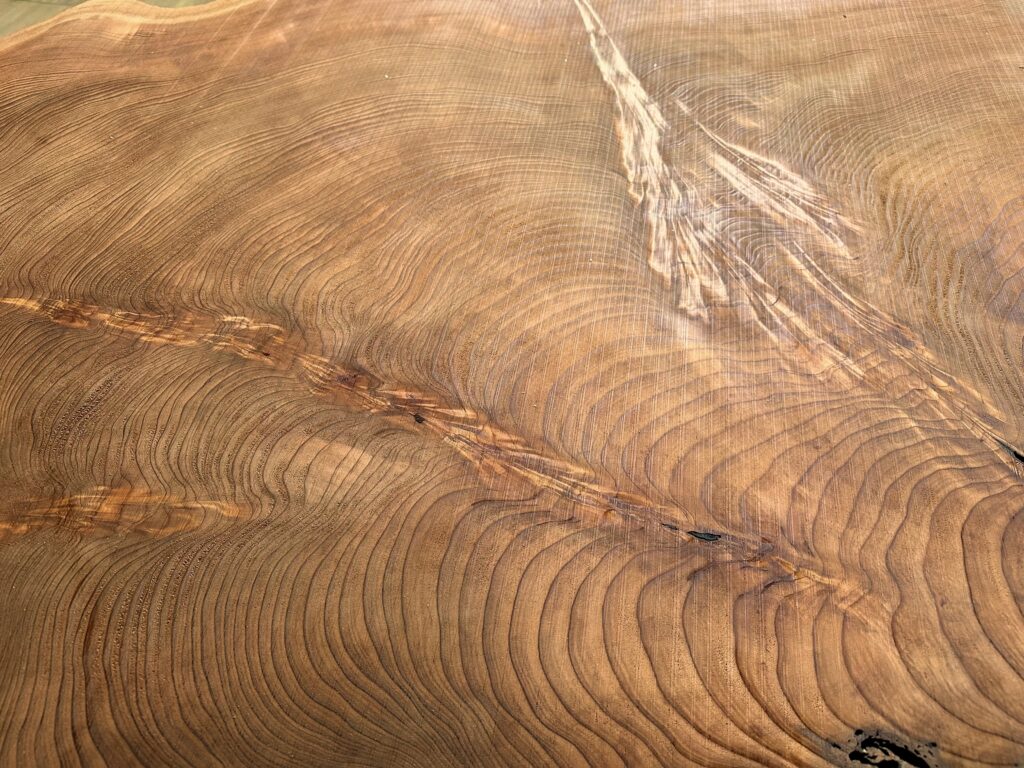 笹の葉が重なったように現れる杢。若い木は単調な山形ですが、年数経過するとギザギザの模様が現れてきます。