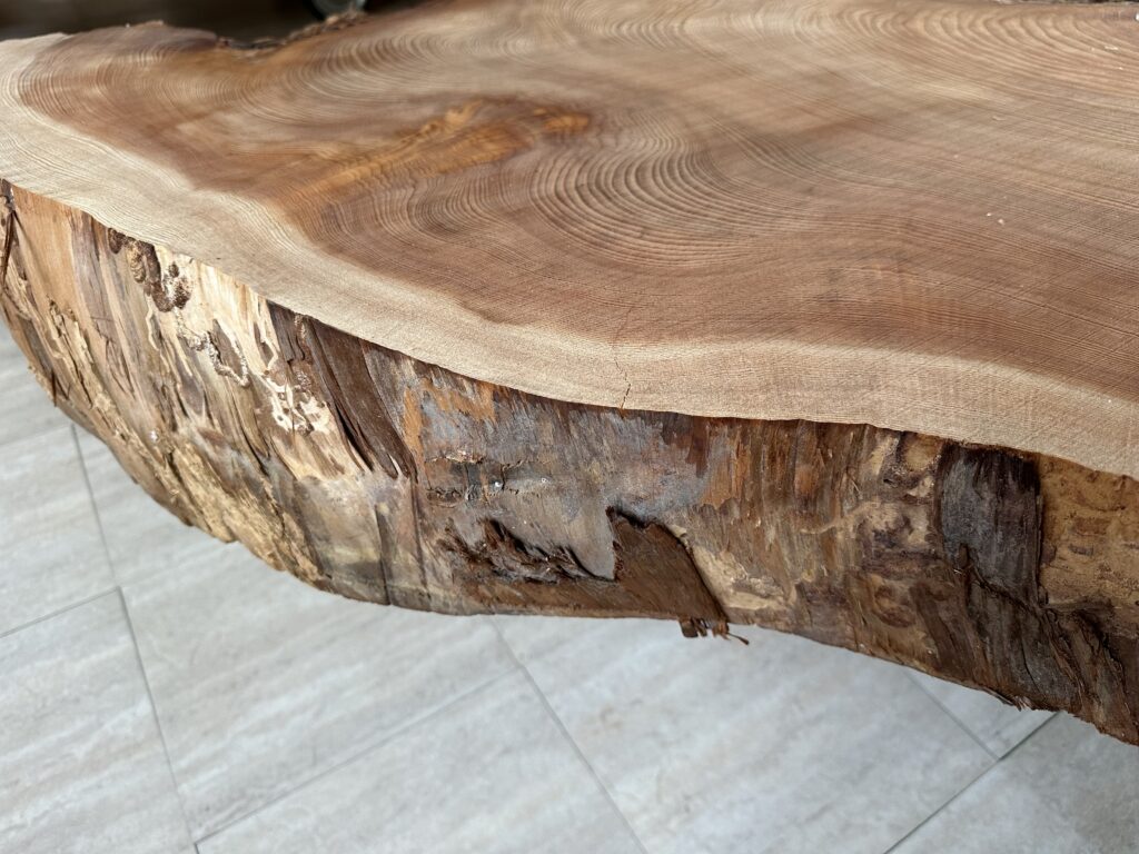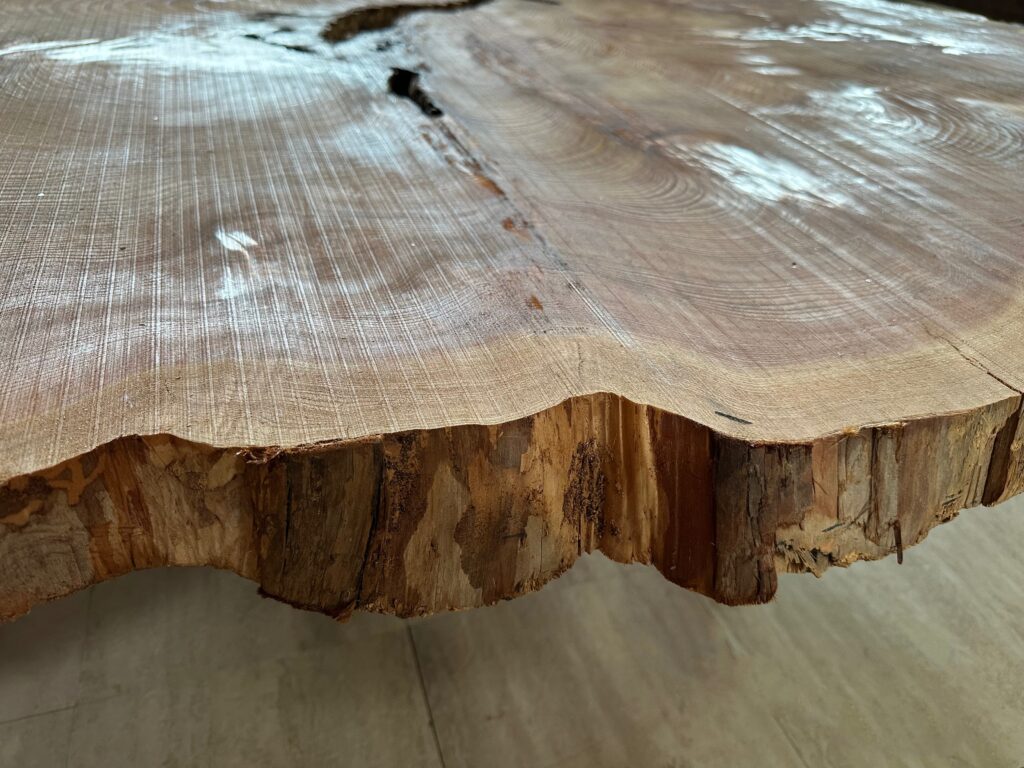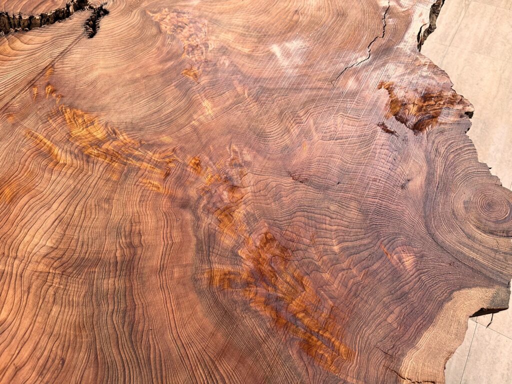 全体に光明杢の美しい杢が縦横に入っており、端部(樹皮側)にいくほど緻密で細かい木目が詰まっています。芯(中心)部分や入り皮(木表面の黒く見えるところ)などには光明杢が入っており、厳しい自然環境を乗り越えてきたことが伺えます。
